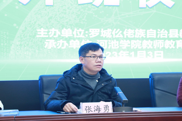 张海勇介绍了罗城县的教育工作情况,阐述了新入职教师岗前培训的目的和意义,勉励学员要认真学习,加强沟通交流,并对参训学员提出了四点要求:一要牢记初心使命,珍惜学习机会,尽快提高自身能力素养;二要遵守培训纪律,严格落实疫情防控措施,做好个人健康的第一责任人;三要坚守师德规范,树立“尚德、仁爱、大美”的教育理念,力争当好人类灵魂的工程师;四要坚守情怀,甘于奉献,爱岗敬业,努力成为罗城县教育事业的参与者、推动者、贡献者。